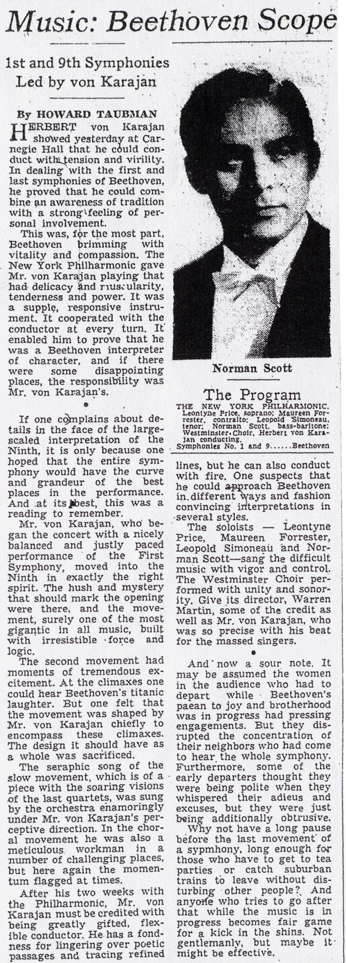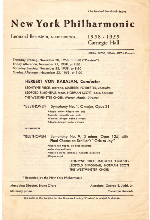 これはアメリカCBSの放送をソースとしたもので、CBSのアナウンサーのコメントも収められています。海賊盤でこの演奏はリリースされたそうですが、ベートーヴェンの第9の4楽章冒頭が欠落してるとか。でもぼくが拾ったファイルは全く問題無しです。録音状態は極めて良好(モノラルですが)です。しかもタダ♪ あっ、演奏された曲目を書いていませんでしたね。 15th Nov. 1958 ウェーベルン; 弦楽のための5つの楽章 モーツァルト; Sym.41 R.シュトラウス; 英雄の生涯(J.コリリアーノ vnソロ) 22nd Nov.1958 ベートーヴェン; Sym.1&9 Leontyne Price(s) Maureen Forrester(ca) Leopold Simoneau(t) Norman Scott(b) Westminster Choir 演奏された1958年はカラヤンが50歳の時。指揮者としてはウィーンフィルはDeccaと、ベルリンフィルはDGとそれぞれ録音契約を結び(録音開始は1959年〜)、プライベートではエリエッテとの結婚と、これから長きに渡りいわゆる帝王カラヤンの時代が誕生する時期です。ご存知かと思いますが、カラヤンをニューヨークフィルに招聘したのは、この1958年にNYPの音楽監督に就任したバーンスタインによるもの。1958年はこれからの二人の運命を大きく変えたといっても過言ではない年です。 カラヤンの演奏ですが、何かもう挑戦的とも思えるようなハイカロリーな内容です。クールなカラヤンの既存イメージはどこにもありません。カラヤンもニューヨークフィルも燃えに燃えています、ちょっと尋常ではない位に。 契約問題や様々な関係でこの演奏の正規盤が登場するのは相当困難かもしれませんが、是非リリースしてもらいたいですね。 なおこのファイルをMediaFireというファイル交換サイトにuploadしたのはこの人です。 書き込み内で載せた画像は、いずれも拝借ものです、スンマセン。
