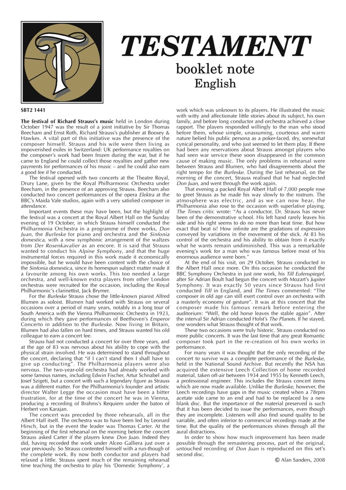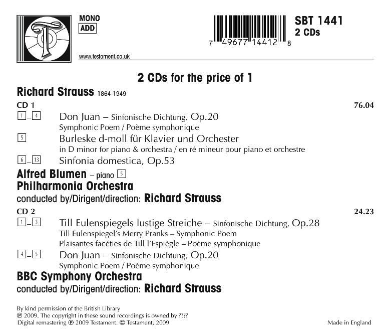 店頭でこのTESTAMENTのCDを見た時、ぼくは自分の目を疑いました。シュトラウスが戦後指揮した演奏会の録音が残っていたこと、しかも共演したオーケストラはドイツのオケでもウィーンのオケではないんです。数年前までナチがV-1ロケットを撃ちまくっていた敵対国イギリスはロンドンのフィルハーモニアOrch.、そしてBBCSOとのコンサートライブ、ホールはPromsでおなじみのロイヤルアルバートホール! こんな信じられない共演が果たされたことについては、次のファイル(CDのbookletと同内容)をお読みください(画像をクリックしてね)。 指揮をしたシュトラウスは当時83歳ですが、とても老人が指揮しているとは全く想像できないほど実に溌剌としています。なおブルレスケを除き、収録された各作品共に音楽の欠落がかなりあるし、録音状態も決してよくないので、入門者(?)にはさすがにおすすめできませんが、シュトラウスファンは必携のCDです。 なおこれからTESTAMENTからはこれからジュリーニがベルリンフィルと共演した様々な録音がリリースされるようです。中にはブルックナーのSYM.7やSYM.8なんかも。 詳しくはWhat's Newのサイトを覗いてみてください。 2009年のニューイヤーコンサートはバレンボイム。 ぼくの期待以上に”もういやぁ〜コンサート”でした。 ハイドンの告別で見せたわざとらしい演技、過剰なほど観衆の手拍子を 仕切ろうとするバレンボイム。ぼくが今迄聴いた中で間違いなく最悪の ニューイヤーコンサートでした。 一方贅沢なほど素敵なニューイヤーコンサートだった、という印象を 与えてくれたのはカラヤン(1987年)。 WPOがまさにWPOだった最期のニューイヤーコンサートでは? ところでiTunes Storeではもうバレンボイムのニューイヤーコンサートの CD音源が発売されています。 ぼくは全く買う気はありませんが、関心のある方はこちらまで。