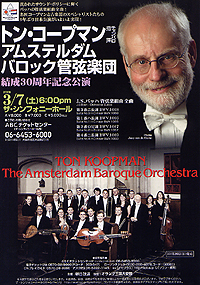これまで聴いたコンサートで忘れられないコンサートと言えば、 チェリビダッケとロンドンSOやミュンヘンフィル、クーベリークとチェコPO、 ベルティーニと都響の最期のマーラーSym.9など・・・。 今晩のコンサートはトン・コープマンとアムステルダム・バロック・オーケストラの バッハの管弦楽曲組曲。 音楽がこれほど素晴らしく、表現豊かで、そして想像力をかき立てて くれるものとは、このコンサート聴くまで実は分かっていなかった、と 思い知らされました。 コープマンの演奏は決して飾り立てる事もなく、無理な緊張感を強いることもなく、 ただただバッハの作品を奏でるだけなんですが、そんな音楽に対する姿勢から 醸し出される音楽の大きさに圧倒されました。 ぼくは演奏が始まって僅か数小節を聴いた直後から、なぜか微笑みながら涙が こぼれました(なんか変な人みたいですよね)。こんな体験は初めてです。 トン・コープマンとアムステルダム・バロック・オーケストラは香港公演の後、 久々に日本公演がありますが、招聘元のムジークレーベンが破産したため、 東京公演はキャンセル、大阪と茅ヶ崎だけの公演となりますが、是非お時間が ある方は聴きにいってみてください。 なおぼくはこの貴重なコンサートをHK$200(3,000円弱)で聴きました。